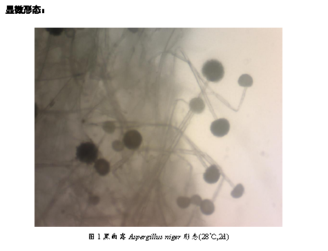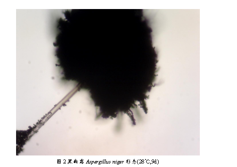 黑曲霉采用玻璃紙法在PDA培養(yǎng)基上接種,28℃培養(yǎng)。第2天即可看到黑曲霉產(chǎn)孢,但產(chǎn)孢較少,第3天可可明顯觀察到產(chǎn)孢量增多。黑曲霉菌絲有隔膜,為多細(xì)胞霉菌。菌絲體產(chǎn)生大量的分生孢子梗,分生孢子梗頂端膨大成為頂囊,一般呈球形。頂囊表面長(zhǎng)滿一層或兩層輻射狀小梗(初生小梗與次生小梗)。最上層小梗瓶狀,頂端著生成串的球形分生孢子。孢子呈黑色。分生孢子梗生于足細(xì)胞上,并通過(guò)足細(xì)胞與營(yíng)養(yǎng)菌絲相連。培養(yǎng)一周后,可看到明顯的孢子脫落。連續(xù)觀察2周,仍然可以觀察到黑曲霉的產(chǎn)孢結(jié)構(gòu),分生孢子易觀察。